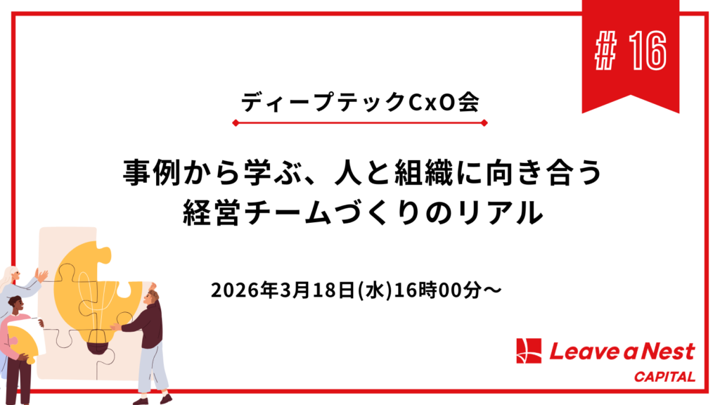 今回のディープテックCxO会では、経営チームの立ち上げや拡大、役割や関係性の変化といった局面において、実際の現場でどのような出来事が起こり、どのような判断が積み重ねられてきたのかをベンチャーの方に話していただきます。